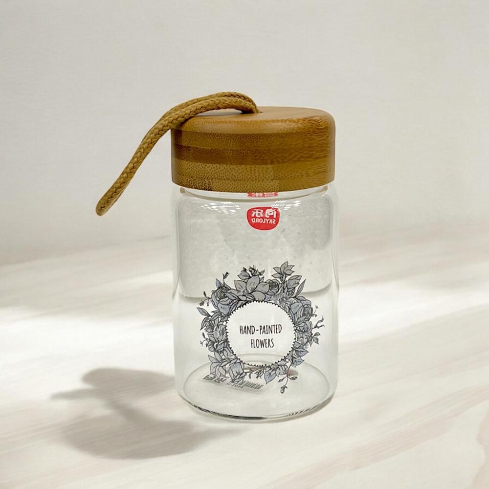 برطمان زجاجي صغير بغطاء خشبي أنيق وحبل لحمل مريح، مزين برسمة زهور مطبوعة يدوياً تضيف لمسة فنية لطيفة.